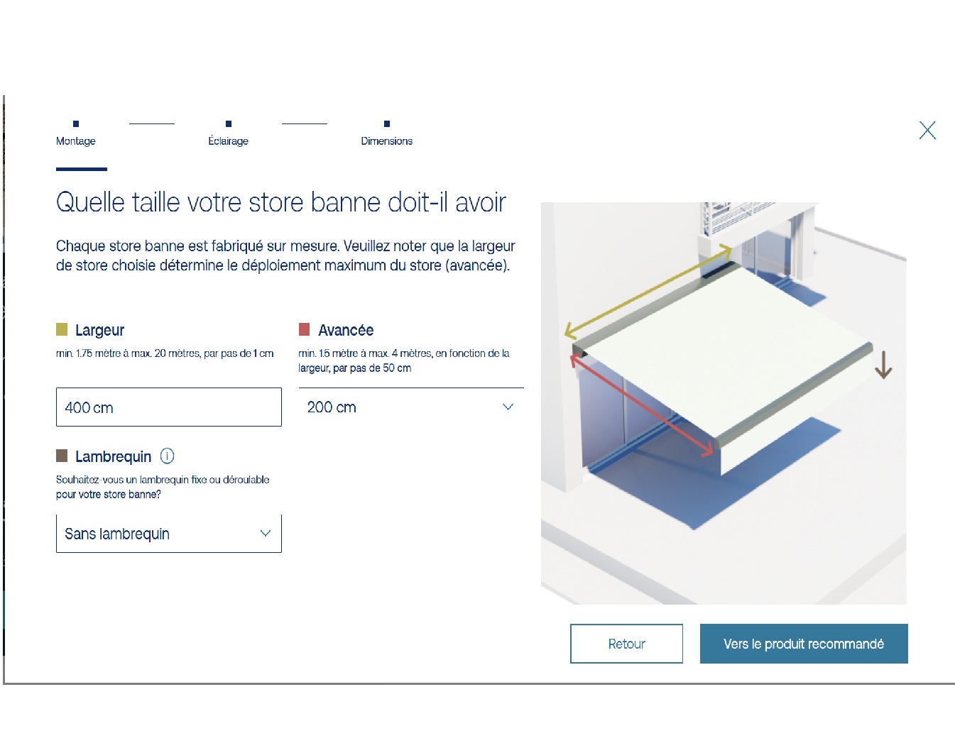 L’utilisateur commence par préciser le mode d’installation du store banne :